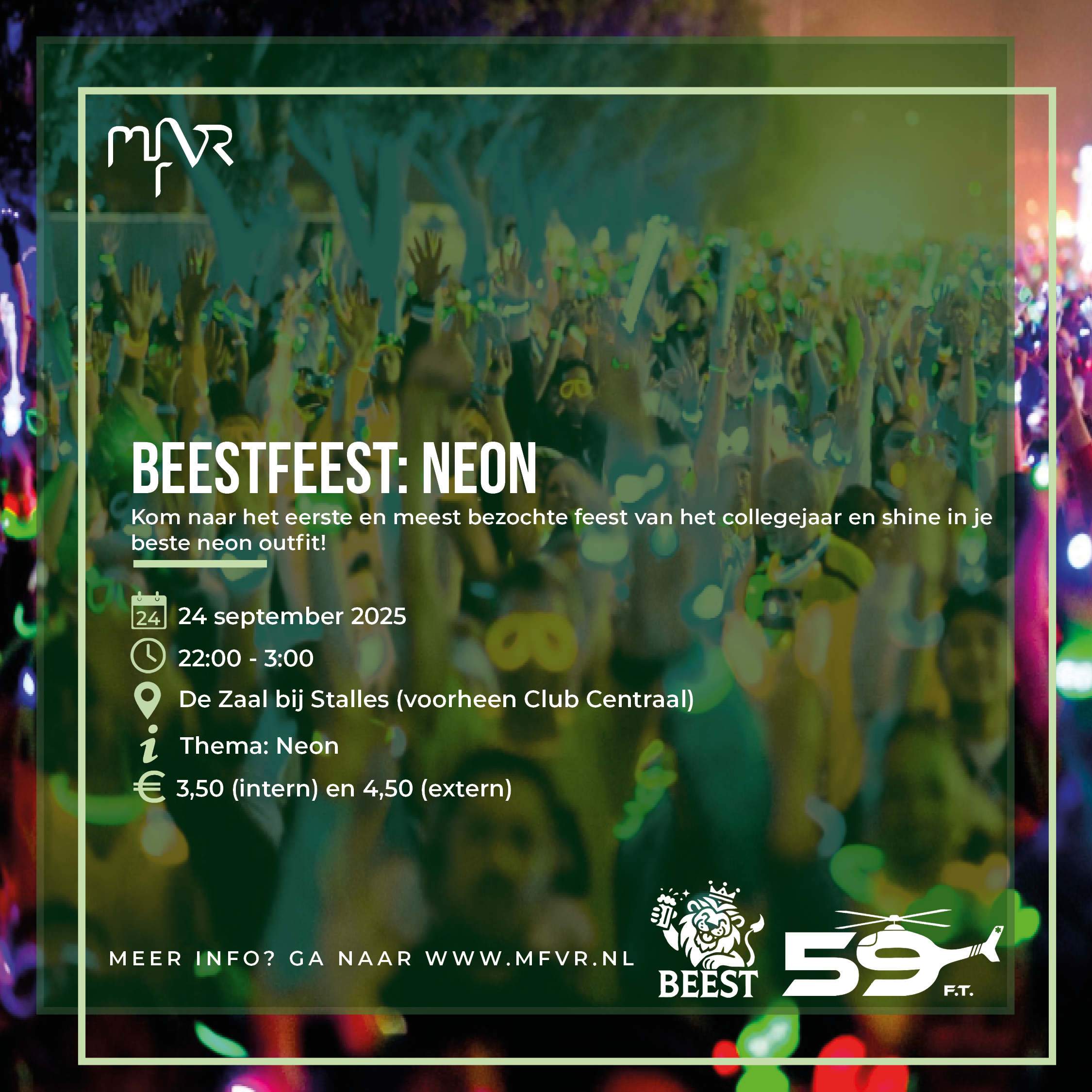 Op 24 september is het eindelijk zover: het allereerste BEEST-feest van het jaar! 🎉 We trappen het begin van het collegejaar af met een kleurrijk thema: NEON. Trek dus je meest felle, fluorescerende of glow-in-the-dark outfit uit de kast. Spoor vooral je vrienden (van vroeger) aan om mee te feesten want externen zijn weer welkom!