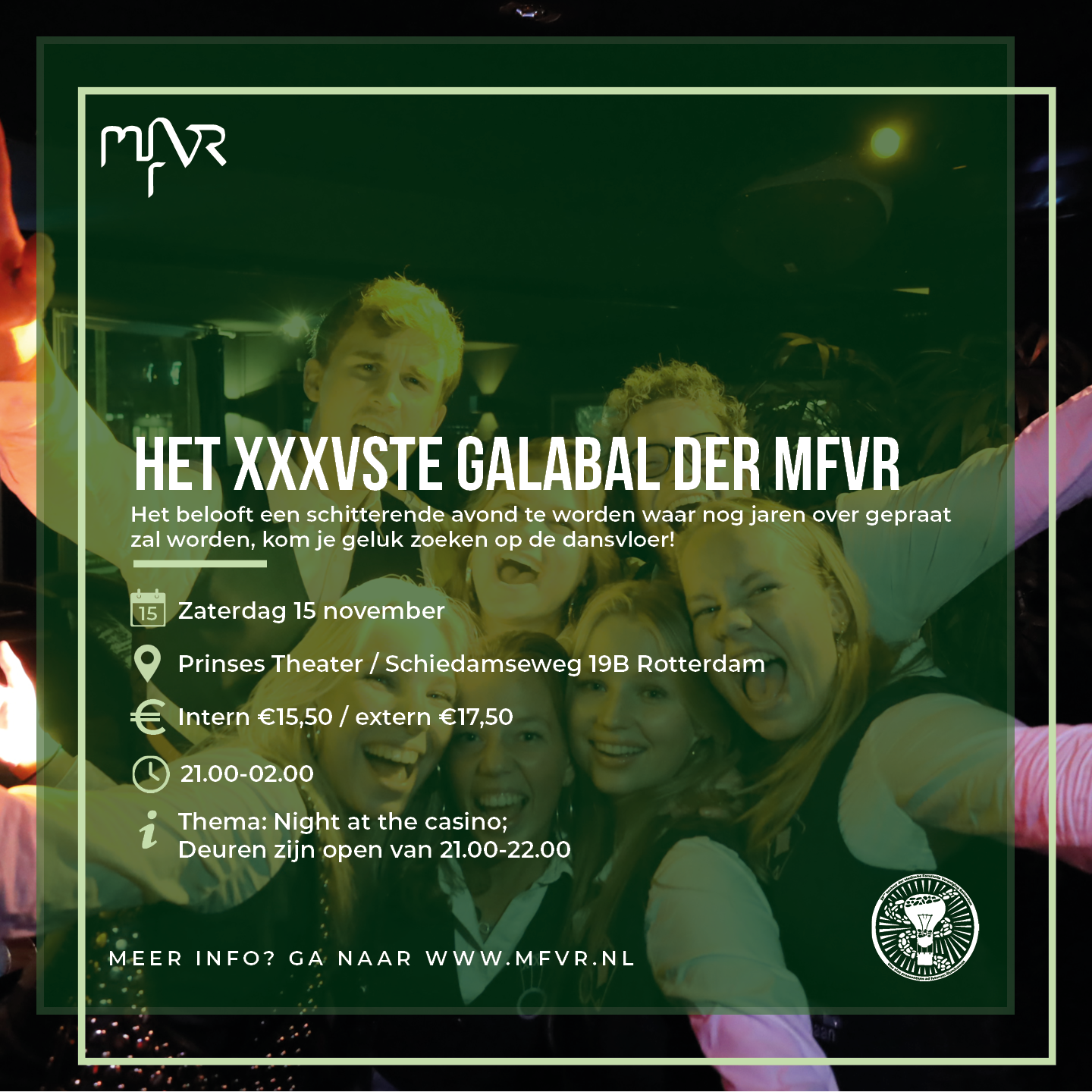 Na een erg geslaagde borrel is het thema eindelijk bekend: Night at the casino! Vanmiddag om 12.59 gaat de kaartverkoop van het XXXVste galabal der MFVR open. De kaartjes zijn intern €15,50 en extern €17,50, inclusief 2 gratis drankjes!!!