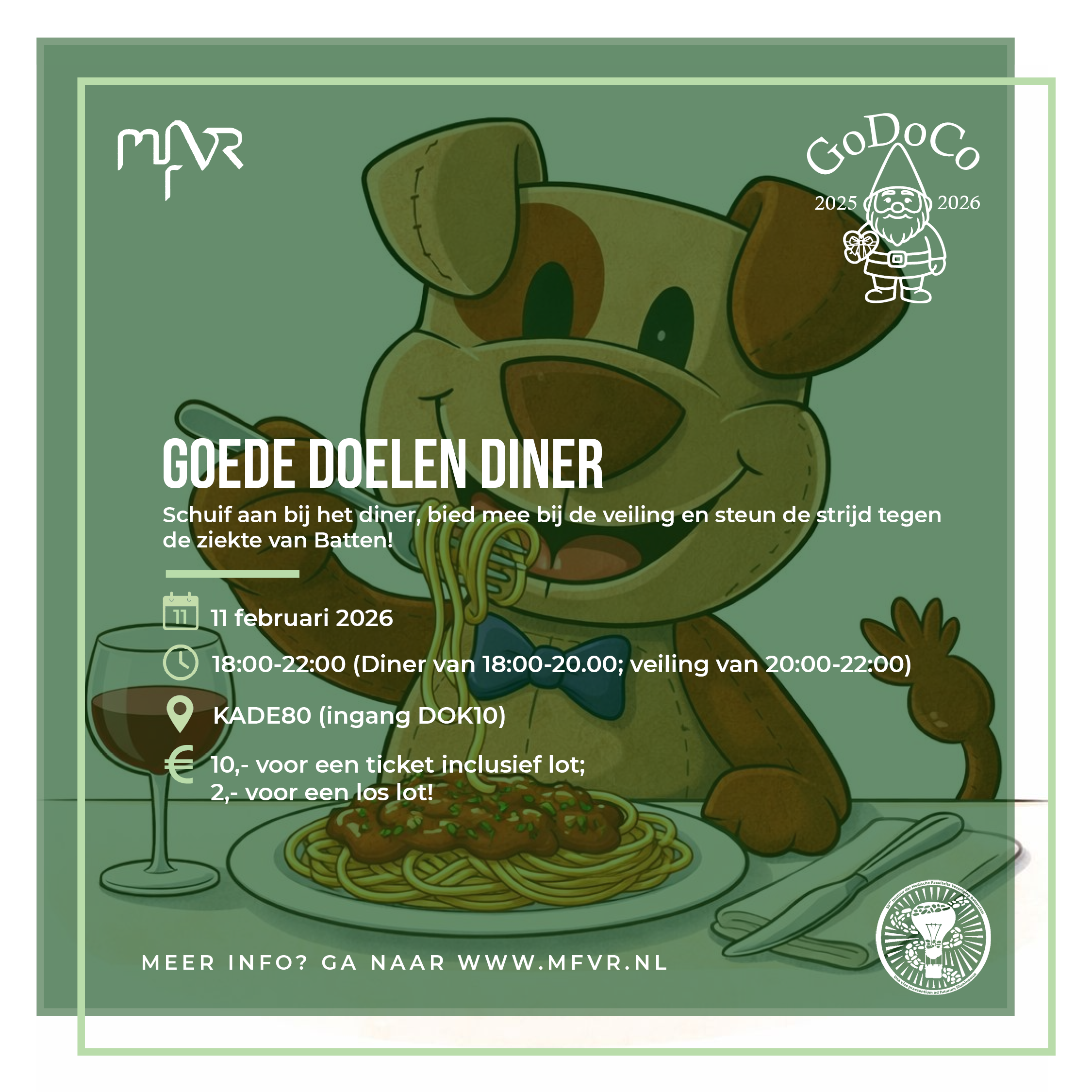 Op 11 februari is het weer tijd voor het jaarlijkse Goede Doelen Diner. Dit jaar zetten we ons in voor Beat Batten, een stichting die onderzoek ondersteunt naar een behandeling voor de ziekte van Batten. Dit is een ernstige en helaas dodelijke stofwisselingsziekte, waarbij kinderen te maken krijgen met kinderdementie. We maken er een bijzondere en gezellige avond van, bestaande uit een diner, gevolgd door een sluiering en loterij met mooie prijzen. Een ticket kost 10 euro en is inclusief één lot voor de loterij. Een extra los lot kost 2 euro. Het diner vindt plaats bij Kade80. De sluiering en loterij vinden plaats in het OWC. De volledige opbrengst van de tickets, loten en de sluiering gaat rechtstreeks naar stichting Beat Batten! De ticketverkoop start op 28 januari om 13:00 via de MFVR-site. Wees er snel bij, want het is een beperkte plek. Kun je er niet bij zijn? Dan kun je alsnog losse loten kopen en zo Beat Batten steunen!