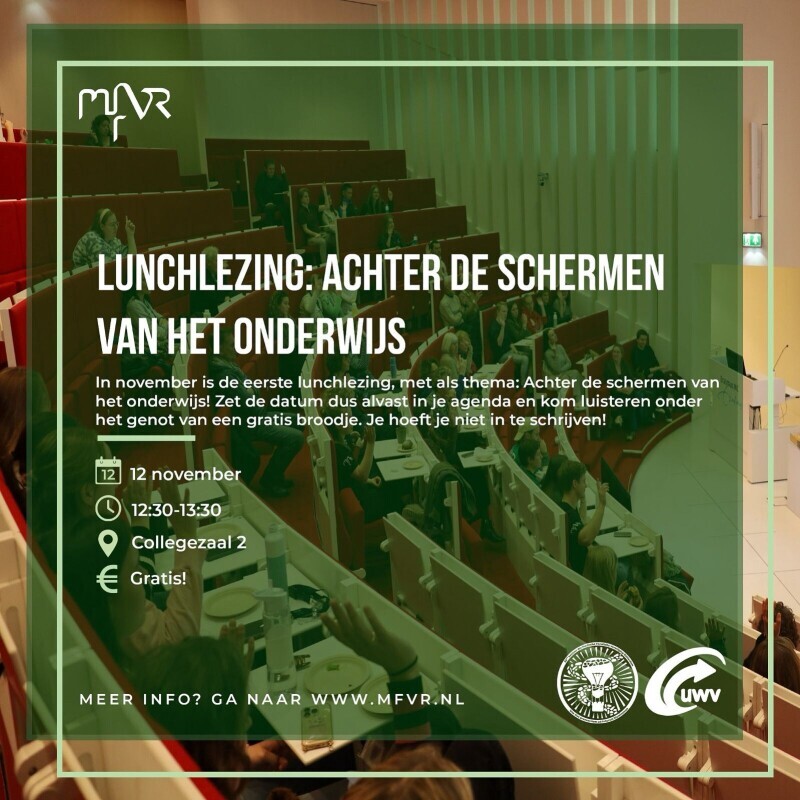 12 november organiseert de MFVR een lunchlezing in het teken van onderwijs! Heb jij affiniteit in het onderwijs of wil jij gewoon meer weten over hoe het er achter de schermen aan toegaat bij het onderwijs? Zet 12 november van 12.30 tot 13.30 uur in je agenda en kom luisteren onder het genot van een gratis broodje. De lezing vindt plaats in collegezaal 2, hopelijk zien we jullie daar!
